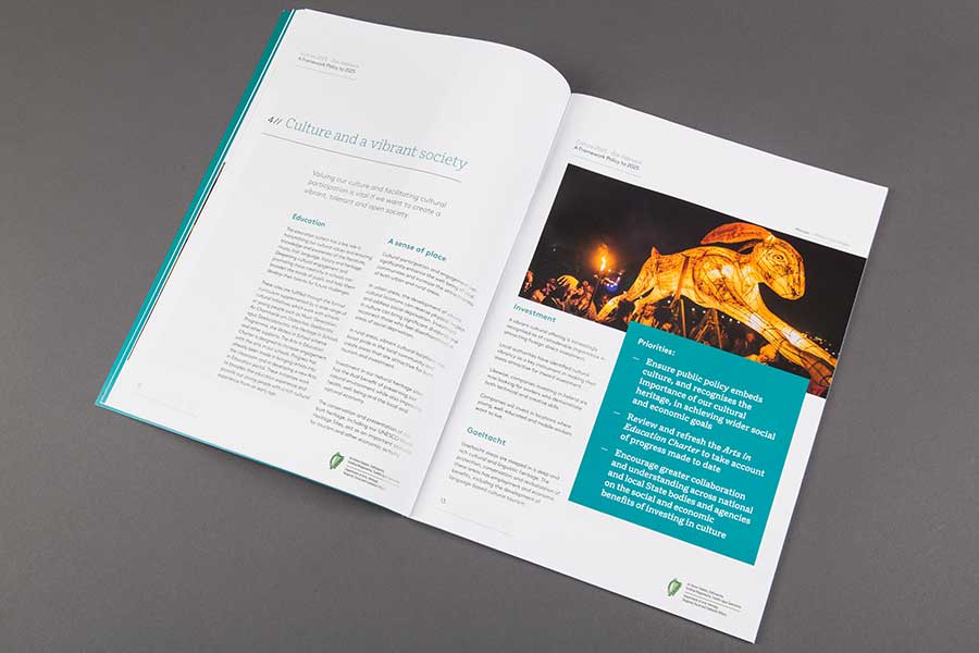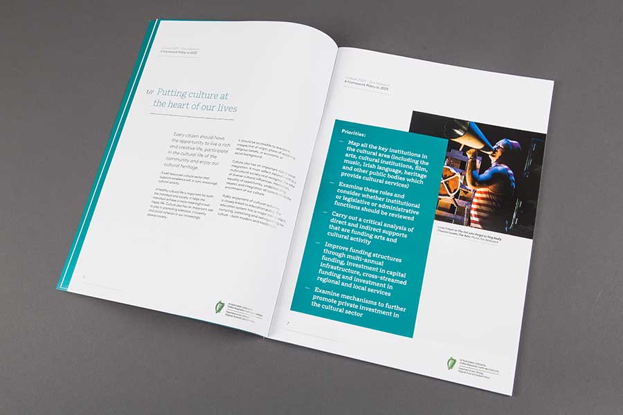 The document sets out an overarching vision and framework for the future and outlines the priorities for action over the coming years. Through this Framework Policy, the Government seeks to nurture creativity, boost citizen participation, help more people to follow a sustainable career in the cultural sector, promote Ireland’s cultural wealth and ensure a cultural contribution to wider social and economic goals.