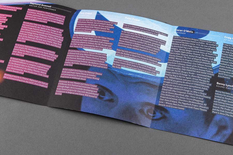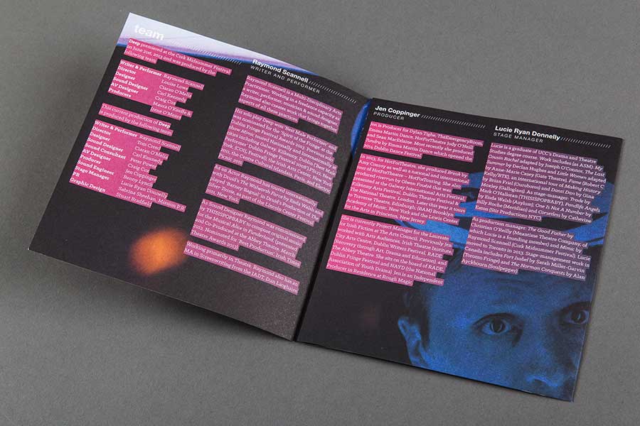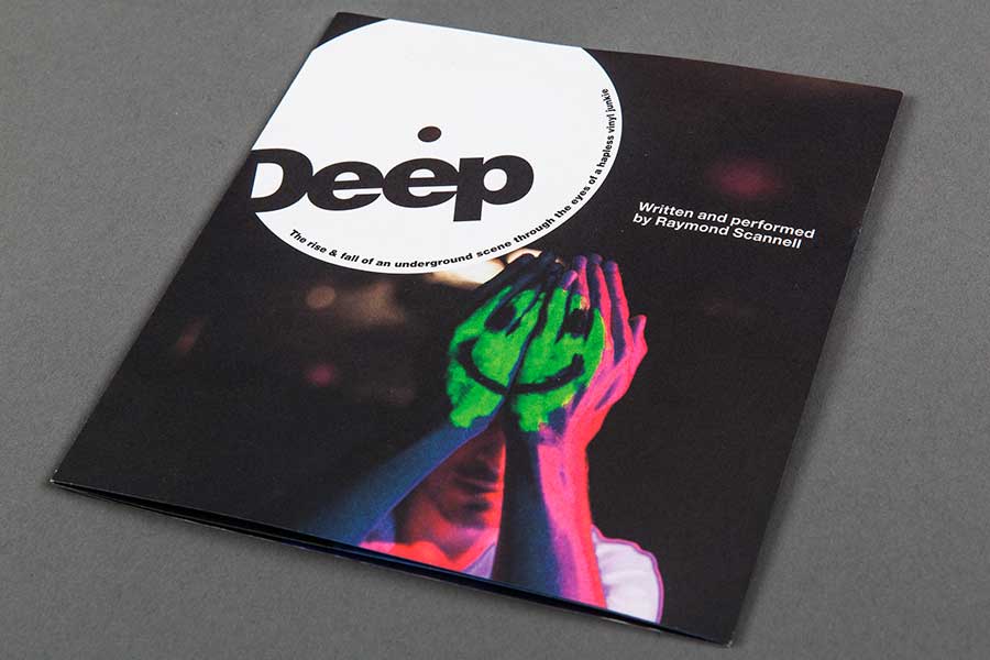 I was delighted to design the printed pieces to accompany this show from Ray Scannell. This prodigious one-man performance won Spirit of the Fringe and was revived for a national tour. From the get-go, the audience is off with his vinyl-obsessing protaganist, the knowingly named Larry Lehane, as he transports us back to the dark-walled, ultraviolet surrounds of a certain house music club in the late eighties. Ray, using various technical devices to people the stage, then guides us through those strobe-lit, blurry scenes and leaves us outside, blinking in the rain, wondering what the hell just happened.