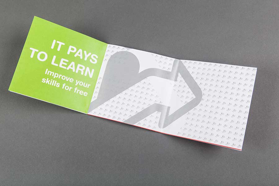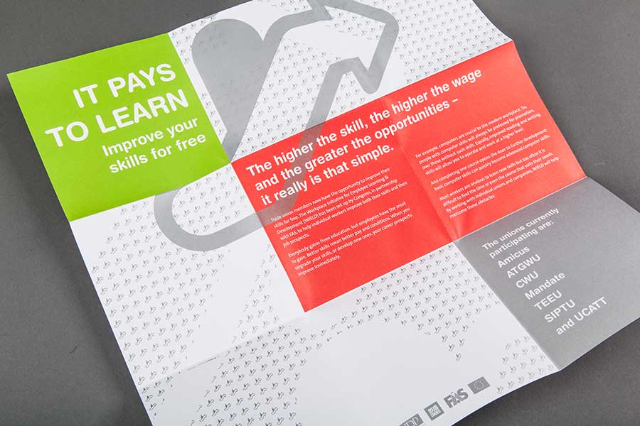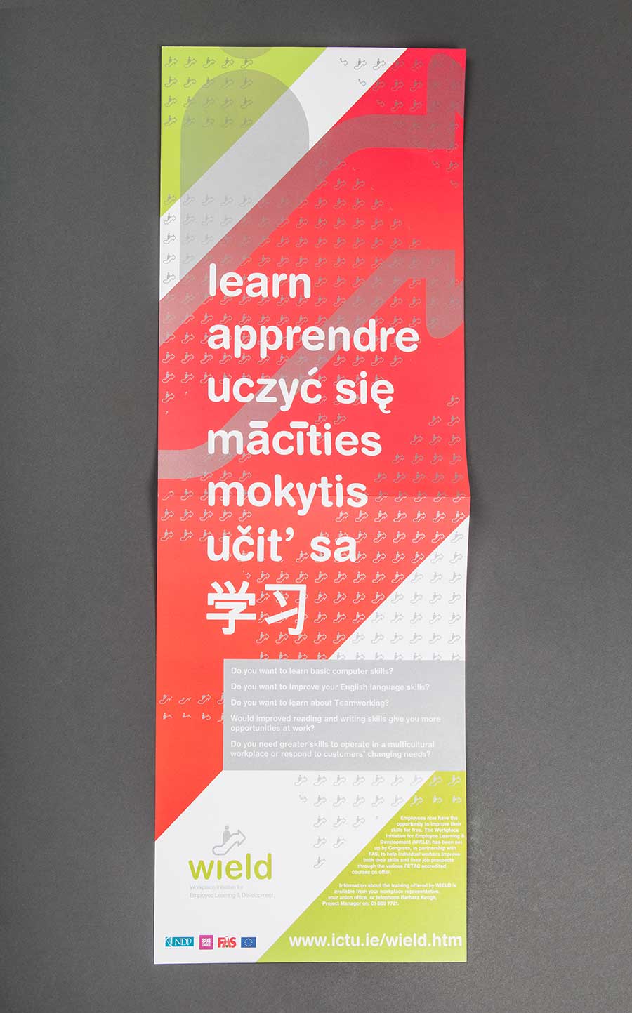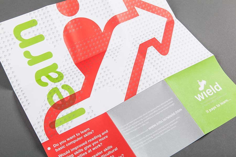 The Irish Congress of Trade Unions, in partnership with FAS, set up The Workplace Initiative for Employee Learning & Development (WIELD) to help individual workers improve both their skills and their job prospects. Better skills mean better pay and conditions - for example people with computer skills will always be preferred for promotion, over those without such skills. We produced a flyer and poster with multiple languages to appeal to a broad spectrum of individuals and printed the items in a range of special colours and metallics.